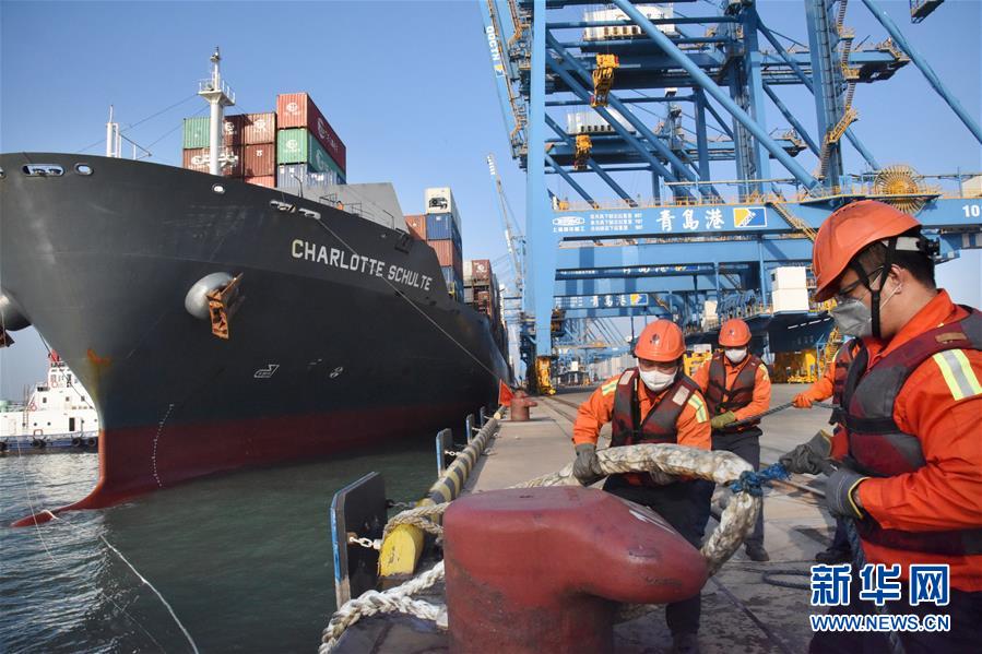 3月17日,工人在青岛港集装箱码头为刚靠港的货轮系缆。 近日,山东港口集团各港区相关企业已全面恢复生产,船舶抵离港班次、集装箱吞吐量等均逐步回升,港口生产有序推进、积极向好。 新华社记者 李紫恒 摄