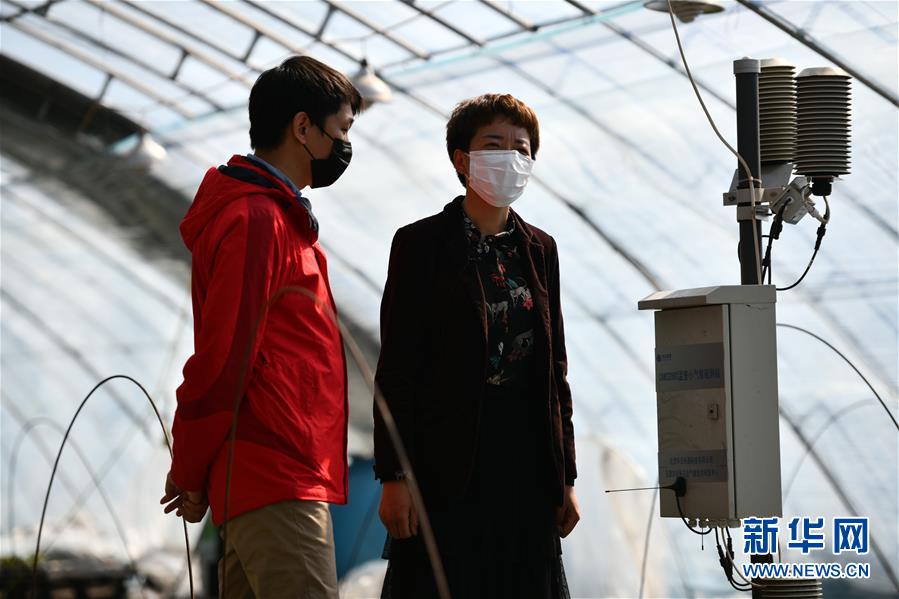 3月17日,天津市武清区气象局高级工程师张昆(左)和合作社负责人郑学伟一起查看大棚内的温室小气候观测站。 连日来,位于天津市武清区高村镇的兴有果蔬种植专业合作社进入出苗高峰期,蔬菜瓜果的种苗日均销售量达10多万株,主要销往京津冀地区。 新华社记者 李然 摄