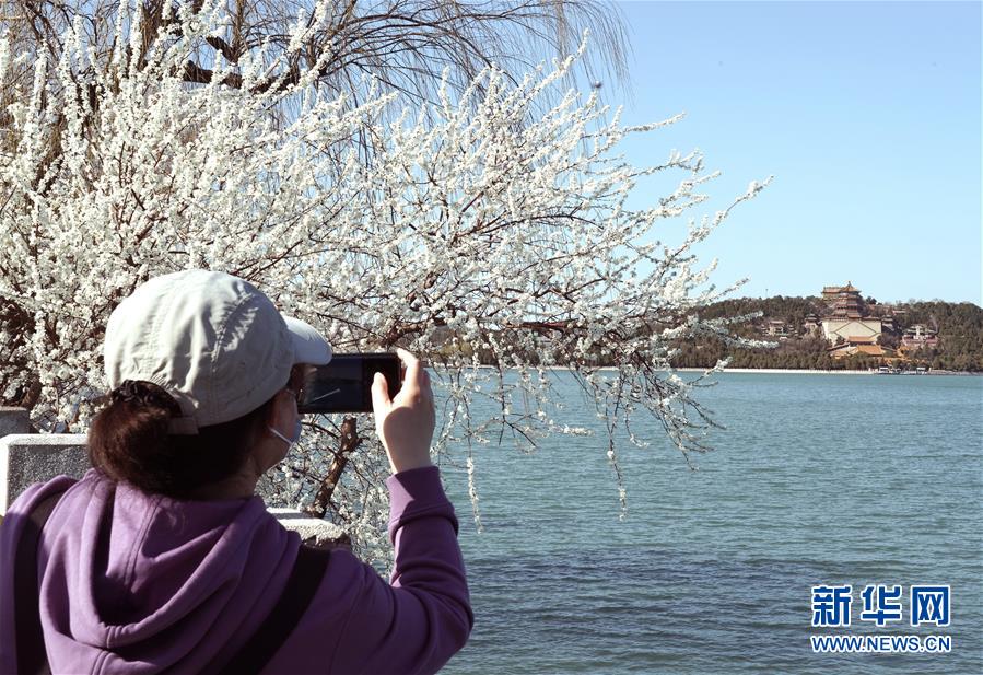 3月17日,一名游客在北京颐和园拍摄,感受春天。 新华社记者 陈建力 摄