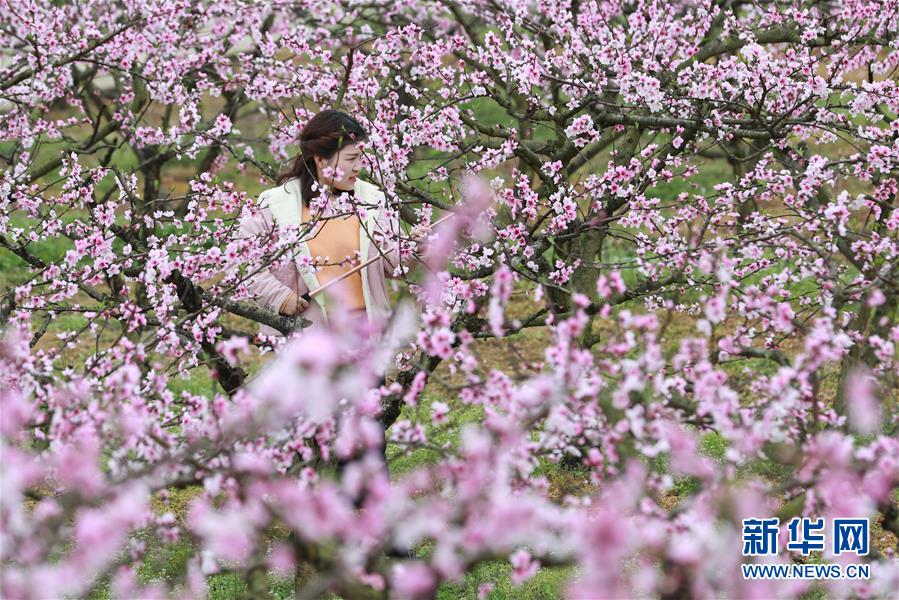 3月17日,游客在贵州省铜仁市玉屏侗族自治县朱家场镇混寨村桃园赏花。 气温回升,各地春暖花开,一派盎然春意。 新华社发(胡攀学 摄)