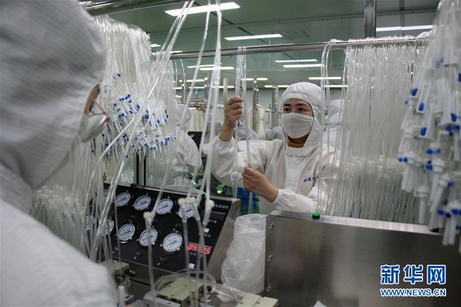 3月17日,山东省滨州市如悦医疗科技有限公司工人在医疗净化车间对输液器进行检堵检漏。 连日来,山东省滨州市如悦医疗科技有限公司在做好疫情防控的同时,依托十万级医疗净化无菌车间,开足马力赶制防护服、输液器等医疗物资订单,满足市场需求。 新华社记者范长国摄