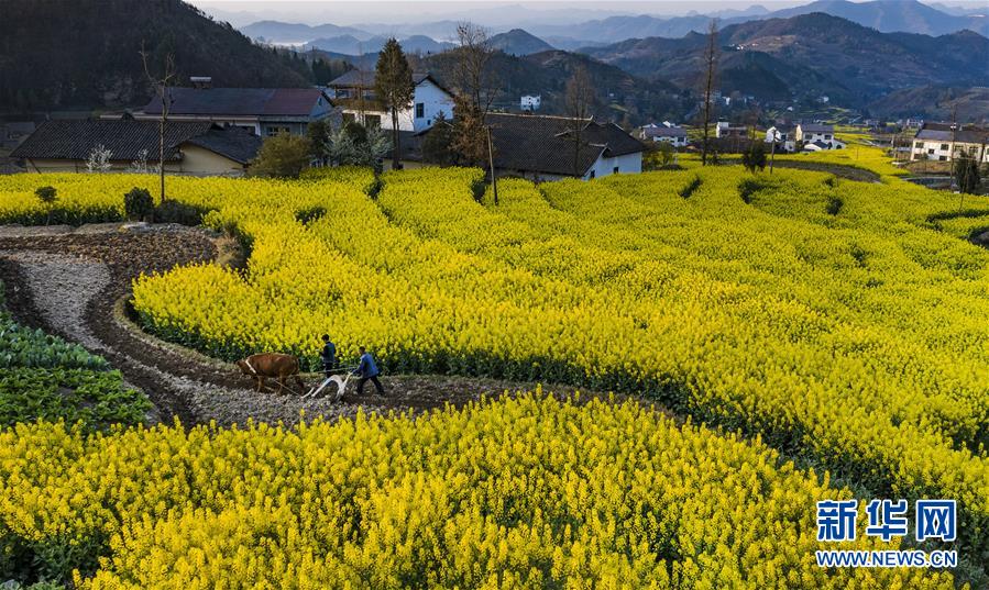 3月18日,汉阴县漩涡镇堰坪村村民在凤堰古梯田里春耕(无人机照片)。 近日,陕西省安康市汉阴县13.2万亩油菜花盛开,构成一幅绚丽的春日画卷。 近年来,汉阴县加大政策性油菜保险力度,由县财政全额补贴保费,稳定油菜种植规模。金灿灿的油菜花不仅是视觉的盛宴,更是辛勤耕作者的希望,据了解今年该县油菜籽总产量预计达2.2万吨。 新华社记者 陶明 摄