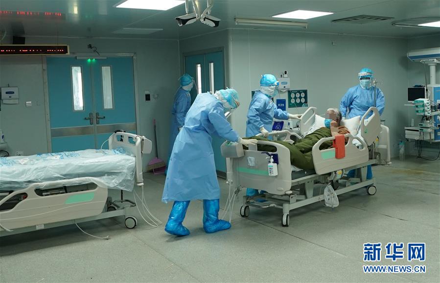 在武汉火神山医院,重症医学一科的医护人员护送病情好转的患者转运出监护室(3月17日摄)。 “红区”是抗疫医院中危重、重症隔离病房的别称。在武汉火神山医院,重症医学一科就把守着这样的“红区”。该科室的医护人员24小时坚守岗位,筑起守护生命和健康的铜墙铁壁。 新华社记者 王毓国 摄