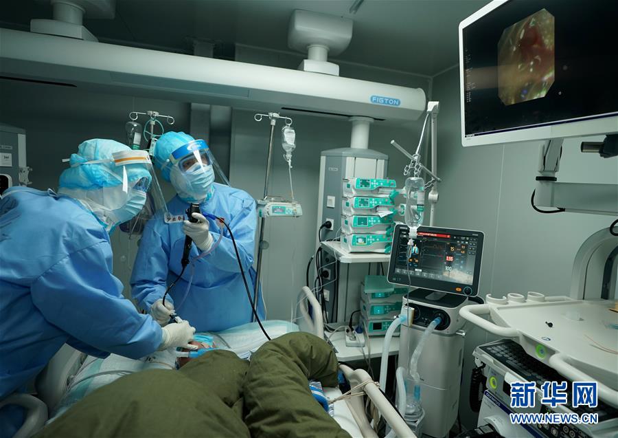 在武汉火神山医院,重症医学一科的医生在给患者实施气管镜下痰液清理(3月17日摄) “红区”是抗疫医院中危重、重症隔离病房的别称。在武汉火神山医院,重症医学一科就把守着这样的“红区”。该科室的医护人员24小时坚守岗位,筑起守护生命和健康的铜墙铁壁。 新华社记者 王毓国 摄