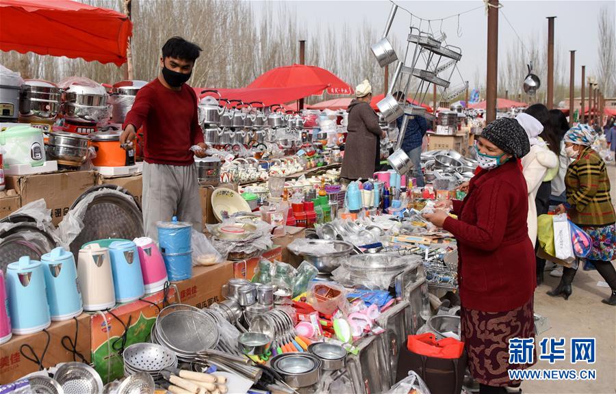 3月17日,在新疆英吉沙县萨罕乡的巴扎上,当地百姓购买生活用品。 当日是新疆英吉沙县萨罕乡的“巴扎日”,人们在巴扎上选购生产生活用品、品尝美食。 新华社记者丁磊摄