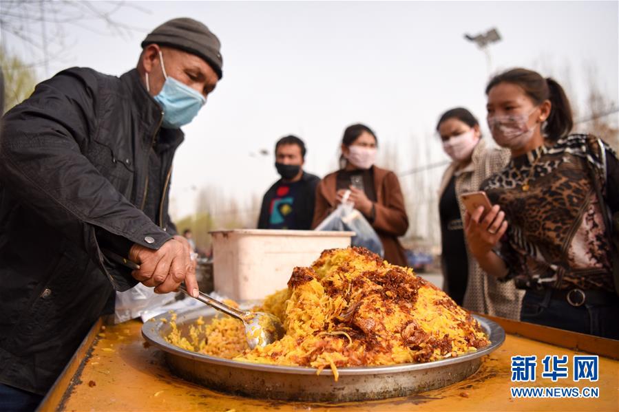 3月17日,在新疆英吉沙县萨罕乡的巴扎上,当地百姓购买特色美食。 当日是新疆英吉沙县萨罕乡的“巴扎日”,人们在巴扎上选购生产生活用品、品尝美食。 新华社记者丁磊摄