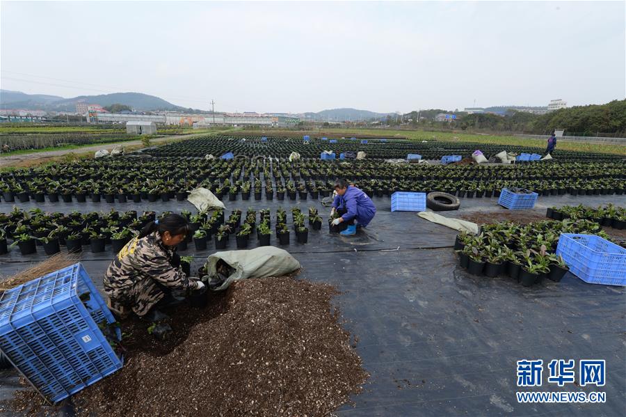 3月17日,爱格花卉基地工作人员在种养区内劳作。 近日,位于湖南省长沙市莲花镇的爱格花卉基地复工开业。据基地负责人莫莎介绍,基地分为展销区和种养区,目前复工面积共约700亩,含500多个品种的花卉及苗木,基地复工后加强线上销售,通过直播“带货”等方式提高销量。 新华社发(陈振海 摄)