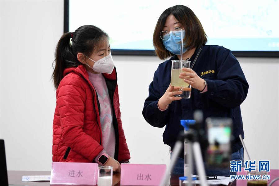 3月18日,合肥市胡大郢污水处理厂工作人员通过线上、线下教学为合肥市曙光小学龙图校区学生讲授污水处理及节约用水知识。新华社记者刘军喜摄