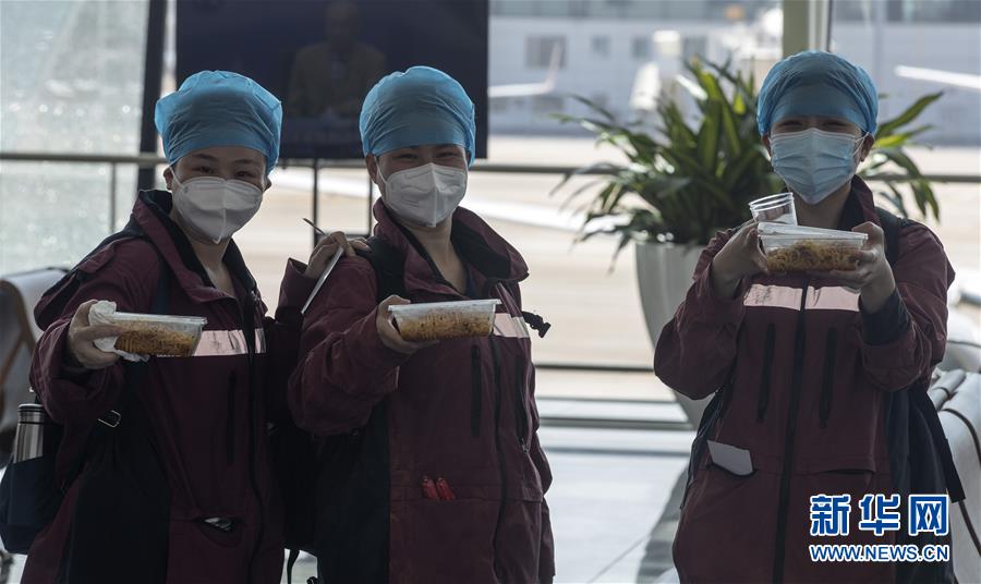 3月18日,在武汉天河机场,福建医疗队队员端着机场特意准备的热干面排队登机。 当日,部分援鄂医疗队陆续离开武汉。 新华社记者 费茂华 摄
