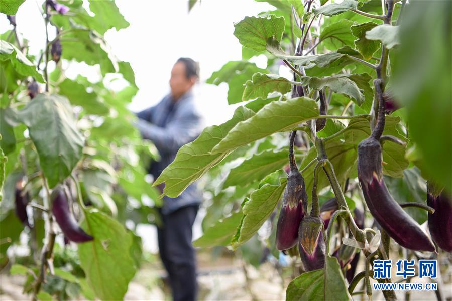3月18日,在莎车县伊什库力乡设施农业基地,种植户在给大棚茄子修枝。新华社记者 丁磊 摄