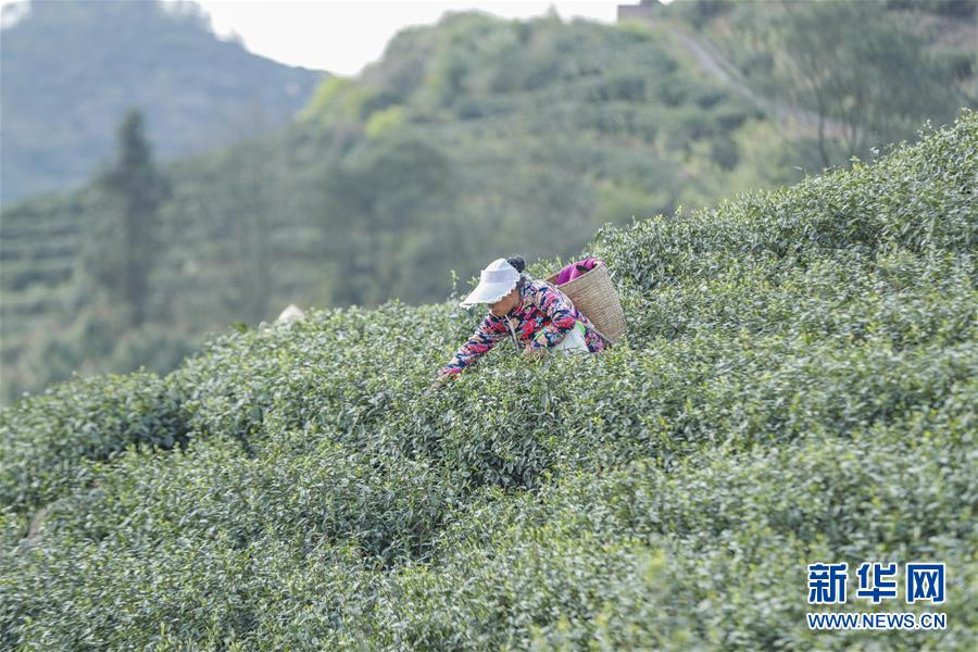 3月18日,在重庆市永川区宝峰镇龙凤桥村,村民在涵晨灵秀茶场的茶山里采茶。新华社发(黄伟 摄)