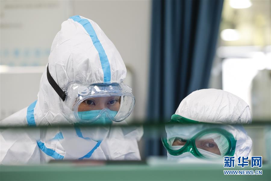 3月18日,金银潭医院护士(左)与浙江省人民医院护士交接工作。 3月17日起,完成救助任务的支援湖北医疗队陆续返程。浙江省第五批支援湖北医疗队是留在武汉继续奋斗在抗疫一线的医疗队伍之一,18日正式接管武汉市金银潭医院的一个病区。这支队伍由浙江省人民医院及五家分院的医务人员组成,涵盖呼吸内科、重症医学科、感染病科等多个科室。 新华社记者 沈伯韩 摄
