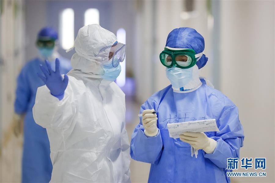 3月18日,金银潭医院护士与浙江省人民医院护士杨捷静(右)交接工作。 3月17日起,完成救助任务的支援湖北医疗队陆续返程。浙江省第五批支援湖北医疗队是留在武汉继续奋斗在抗疫一线的医疗队伍之一,18日正式接管武汉市金银潭医院的一个病区。这支队伍由浙江省人民医院及五家分院的医务人员组成,涵盖呼吸内科、重症医学科、感染病科等多个科室。 新华社记者 沈伯韩 摄