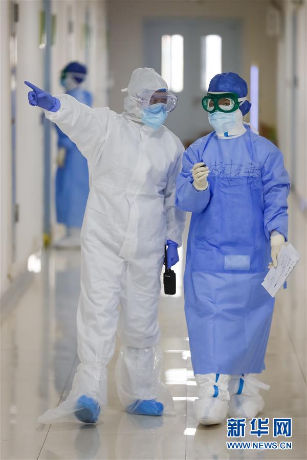 3月18日,金银潭医院护士与浙江省人民医院护士杨捷静(右)交接工作。 3月17日起,完成救助任务的支援湖北医疗队陆续返程。浙江省第五批支援湖北医疗队是留在武汉继续奋斗在抗疫一线的医疗队伍之一,18日正式接管武汉市金银潭医院的一个病区。这支队伍由浙江省人民医院及五家分院的医务人员组成,涵盖呼吸内科、重症医学科、感染病科等多个科室。 新华社记者 沈伯韩 摄
