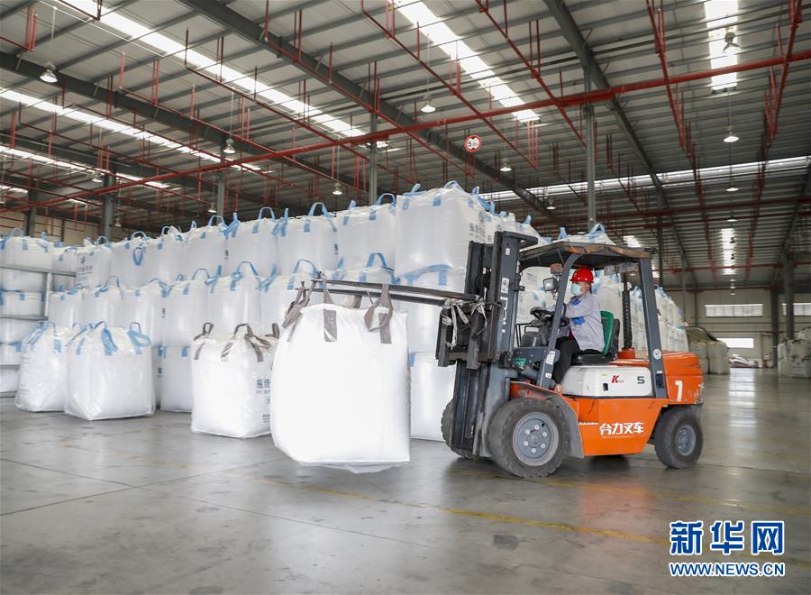 3月16日,在重庆国际物流枢纽园区的中集现代物流中心A区聚酯切片仓库,工作人员将聚酯切片搬运出库。 新华社发 (黄伟 摄)