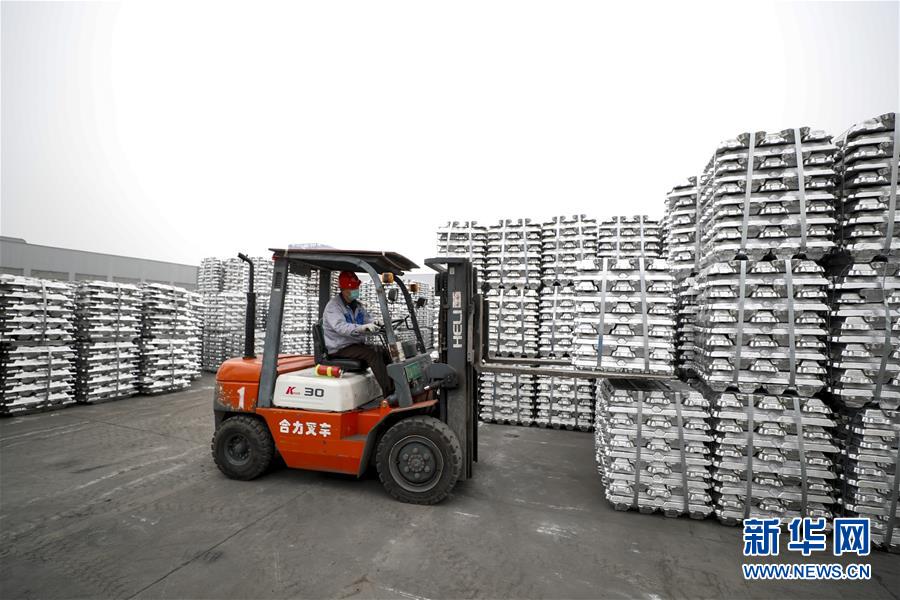 3月16日,在重庆中集现代物流中心A区金属铝期货交割库,工作人员搬运整理铝锭。新华社发 (黄伟 摄)