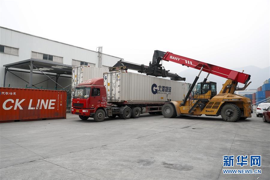 3月16日,在重庆国际物流枢纽园区的西部陆海新通道内陆国际海运集装箱运管中心,工作人员帮客户提取集装箱货柜。新华社发 (黄伟 摄)