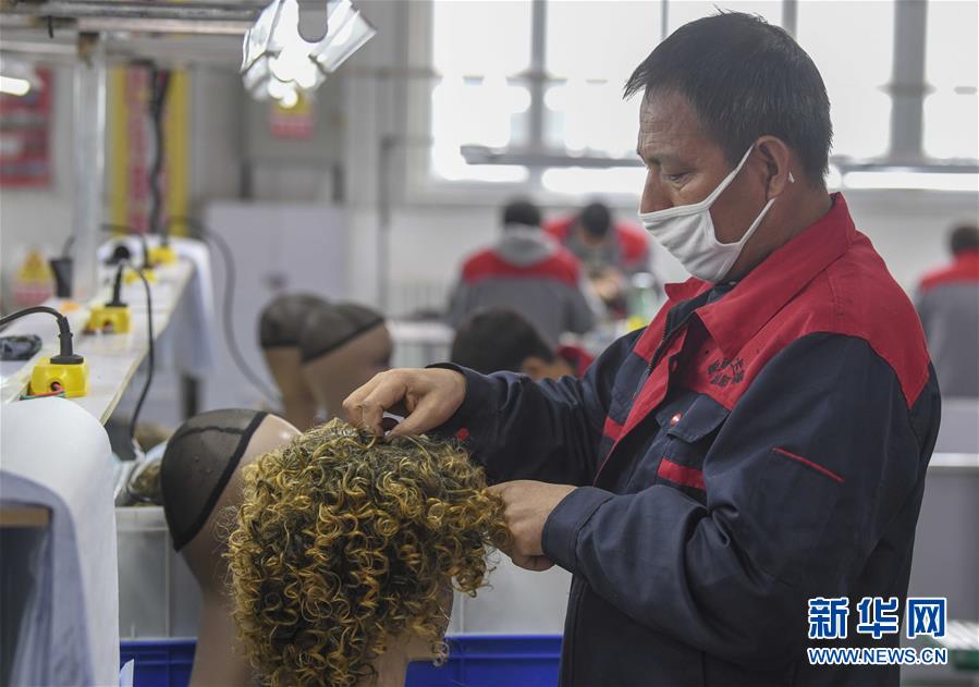 3月18日,在洛浦县北京工业园区内,工人在新疆玛卡娅假发制造有限公司内工作。 近日,在新疆和田地区洛浦县北京工业园区,多家发制品生产企业复工复产,正开足马力完成订单。目前园区内有21家企业从事发制品制造,其中19家已经复工。截至目前,新疆规模以上企业复工率超过90%。 新华社记者 赵戈 摄
