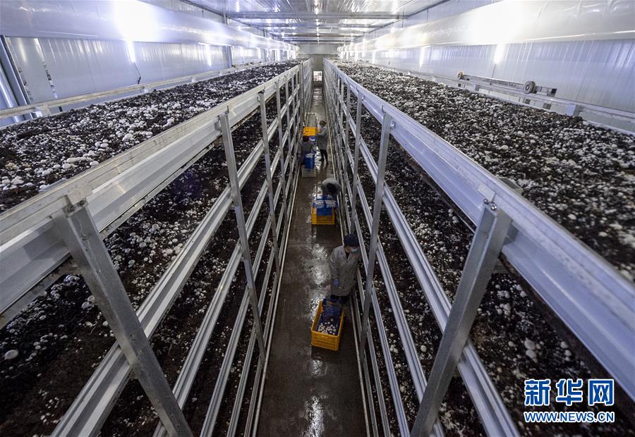 3月18日,在宁夏闽宁镇双孢菇栽培示范基地,农民在采摘蘑菇。新华社记者 杨植森 摄