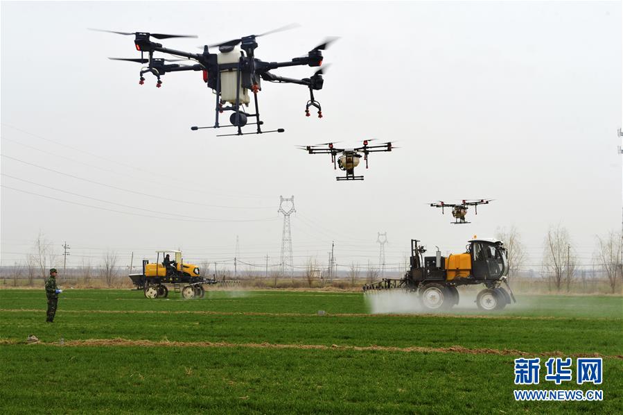 合作社工作人员利用植保无人机和喷雾机在河北省泊头市四营乡黄屯村麦田内作业(3月12日摄)。新华社记者 牟宇 摄