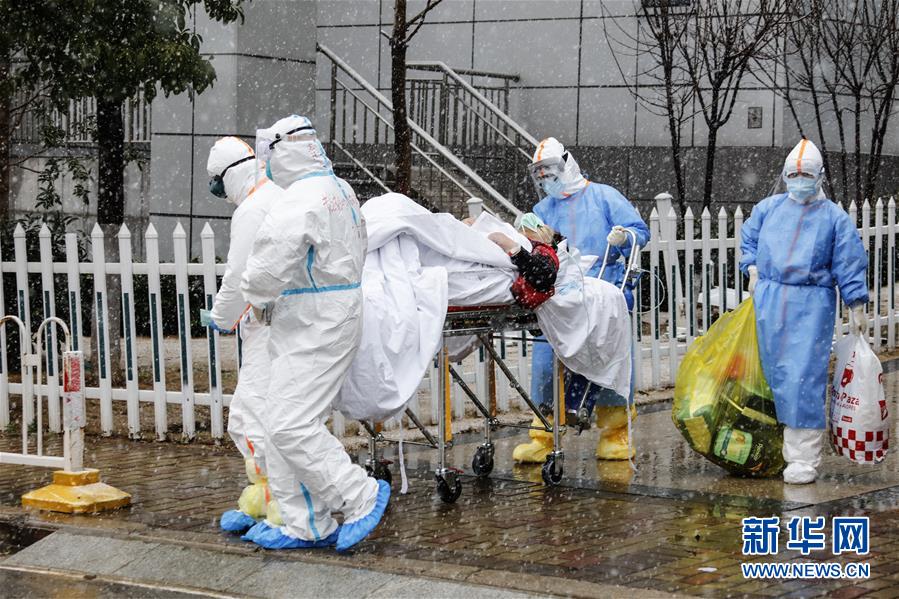 2月15日,在武汉,青海红十字会赴武汉救护转运队的队员和医护人员共同转运一名危重症患者到ICU。 新华社发(付春来 摄)