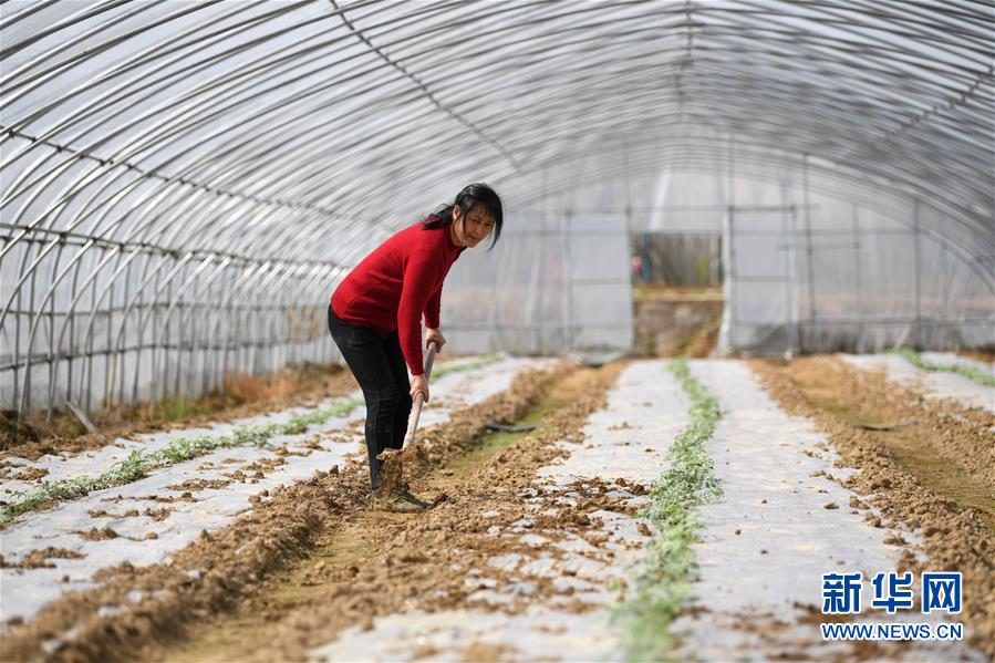 3月19日,肥西县花岗镇杨湾村农民在扶贫大棚内进行田间管理。新华社记者刘军喜摄