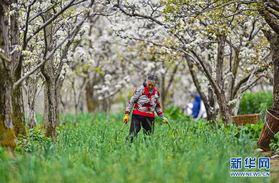 3月19日,汉源县九襄镇新堰村村民在采摘蒜薹。 随着气温回升和春雨到来,四川省汉源县九襄镇等地的村民投入到疏花、人工授粉、育苗等农业劳动中。 新华社记者 江宏景 摄