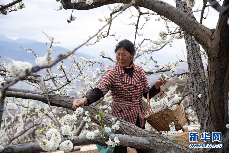 3月19日,汉源县九襄镇后山村村民对梨树进行疏花。 随着气温回升和春雨到来,四川省汉源县九襄镇等地的村民投入到疏花、人工授粉、育苗等农业劳动中。 新华社记者 江宏景 摄