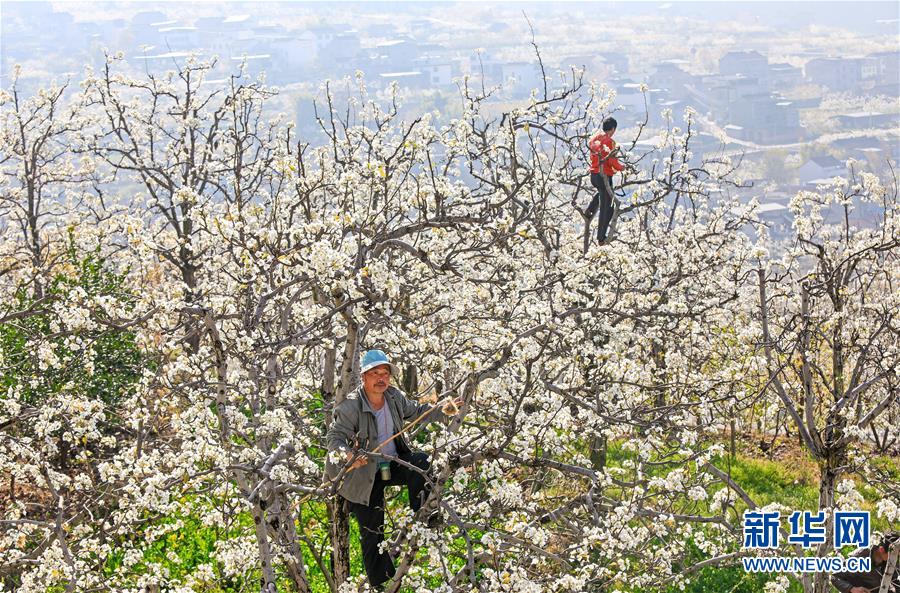3月19日,汉源县九襄镇新堰村村民对梨花人工授粉。 随着气温回升和春雨到来,四川省汉源县九襄镇等地的村民投入到疏花、人工授粉、育苗等农业劳动中。 新华社记者 江宏景 摄