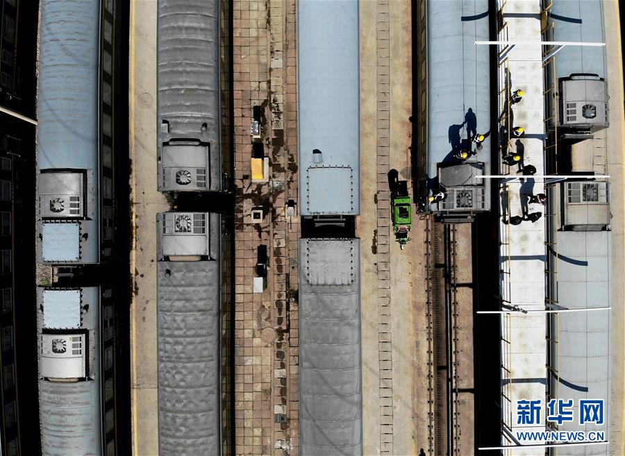 3月19日,郑州车辆段客车检车员在登顶平台上对客车空调机组进行检修作业(无人机照片)。新华社记者 李安 摄
