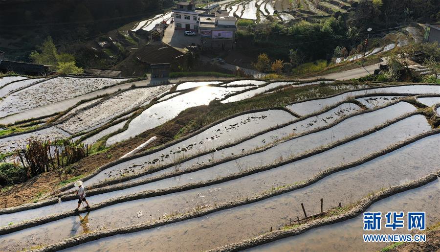 3月20日,岚皋县桂花村村民在古梯田备耕(无人机照片)。 在陕西省安康市岚皋县南宫山镇桂花村,千亩古梯田倒映蓝天青山,构成一幅秀美的山水画卷。 新华社记者 陶明 摄