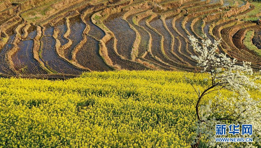 3月20日拍摄的岚皋县桂花村古梯田(无人机照片)。 在陕西省安康市岚皋县南宫山镇桂花村,千亩古梯田倒映蓝天青山,构成一幅秀美的山水画卷。 新华社记者 陶明 摄