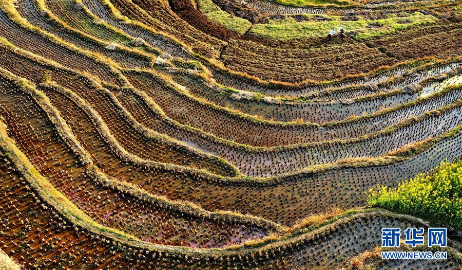 3月20日拍摄的岚皋县桂花村古梯田(无人机照片)。 在陕西省安康市岚皋县南宫山镇桂花村,千亩古梯田倒映蓝天青山,构成一幅秀美的山水画卷。 新华社记者 陶明 摄