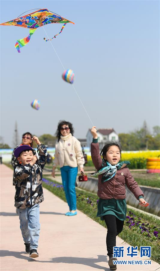 3月20日,游客在移沿山生态景区放风筝。 近日,浙江省湖州市吴兴区八里店镇移沿山生态景区油菜花盛开,吸引游客前来观赏游玩。 新华社记者 翁忻旸 摄