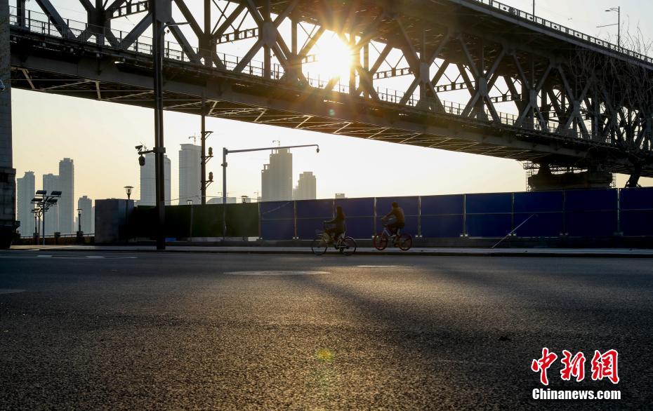 3月20日,两位市民骑车经过落日余晖下的武汉长江大桥。春分时节,夕阳下的武汉显得安静而美丽。中新社记者 张畅 摄