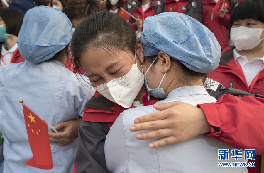 3月21日,武汉市第一医院的桂欣(右)与天津市医疗队队员王勃昆拥抱道别。新华社记者费茂华摄
