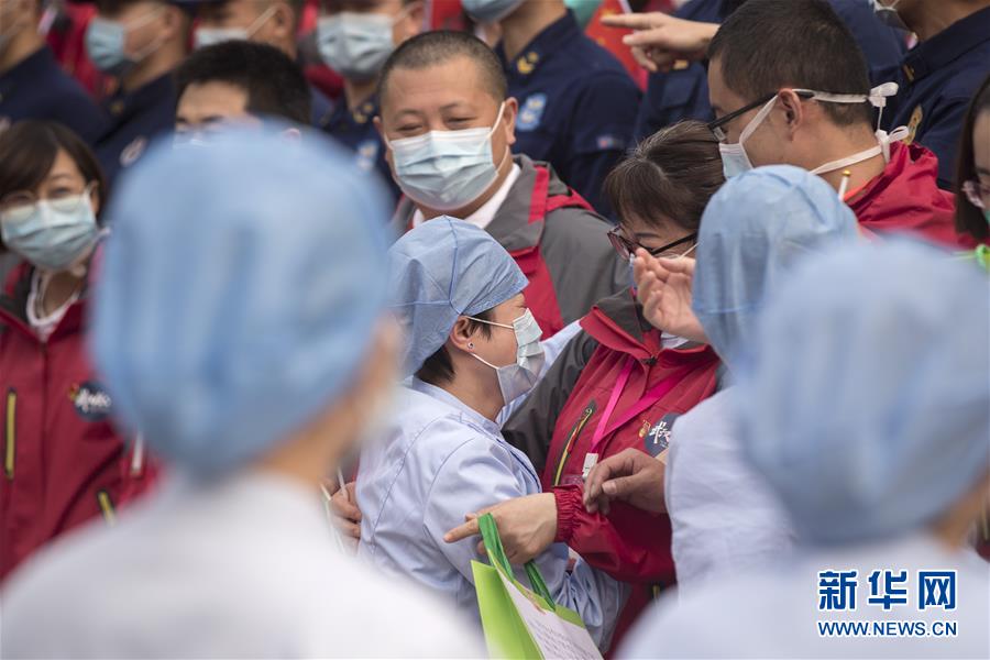 3月21日,武汉市第一医院的护士长杜沛(中左一)与天津市医疗队队员道别。杜沛是负责与天津市医疗队对接的护士长。新华社记者费茂华摄