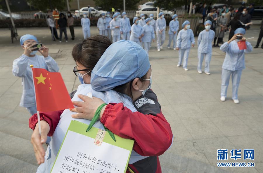 3月21日,武汉市第一医院的医护人员(前)与天津市医疗队队员李梅拥抱道别。新华社记者费茂华摄