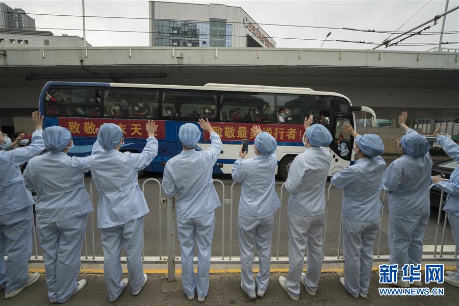 3月21日,武汉市第一医院的医护人员(前)送别天津市医疗队队员。新华社记者费茂华摄