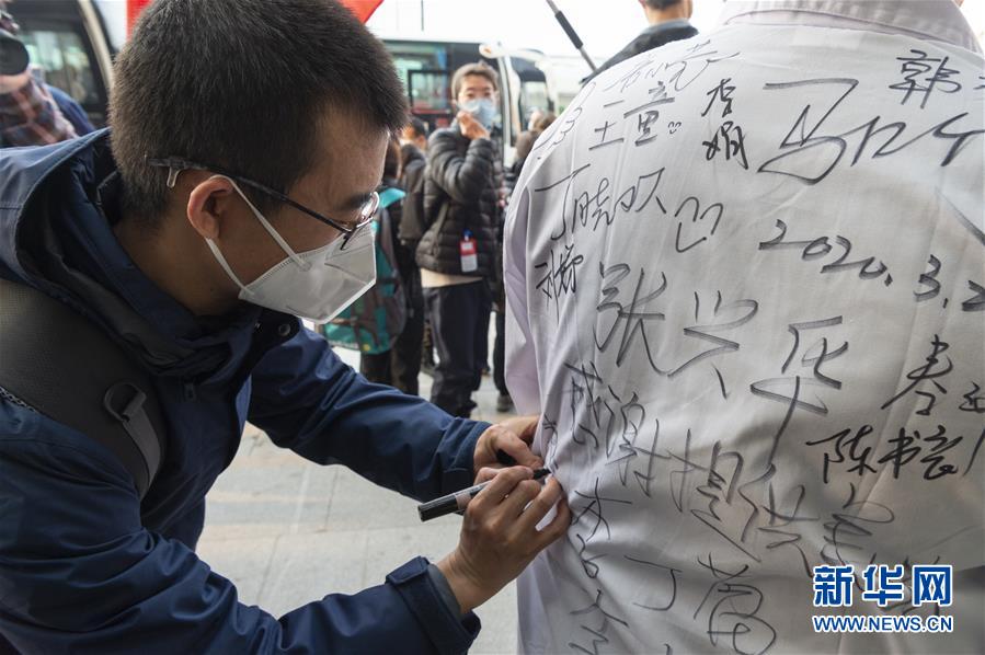 3月21日,医疗队员出发前在张兴龙的工作服上签名。新华社记者 谢剑飞 摄
