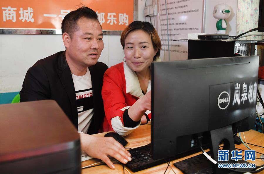 曹刚勇儿子陈洪珊(左)与妻子在开办的网店上为本村群众服务(3月19日摄)。新华社记者陶明摄
