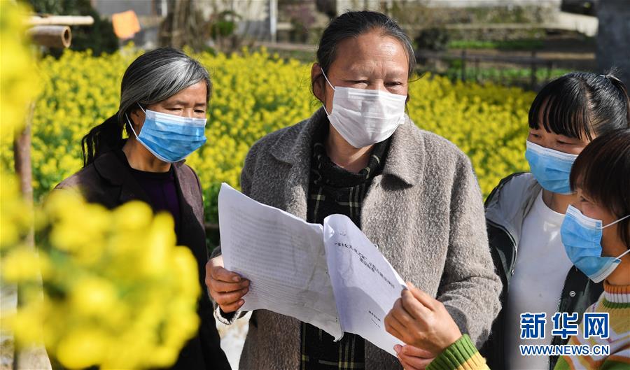 曹刚勇(左二)在村头与群众商讨集体兴办“妇女儿童之家”的事宜(3月19日摄)。新华社记者陶明摄