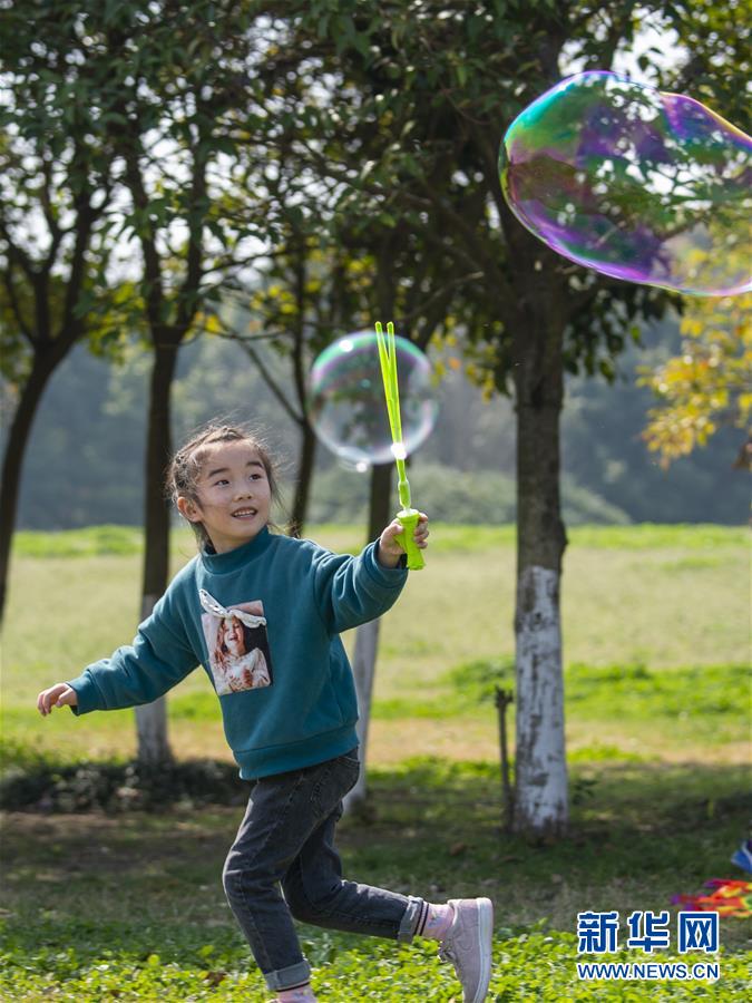 3月21日,一名小朋友在江苏省海安市七星湖公园玩耍。 春暖花开时节,人们走出家门,来到大自然中,感受春的气息。 新华社发(徐劲柏 摄)