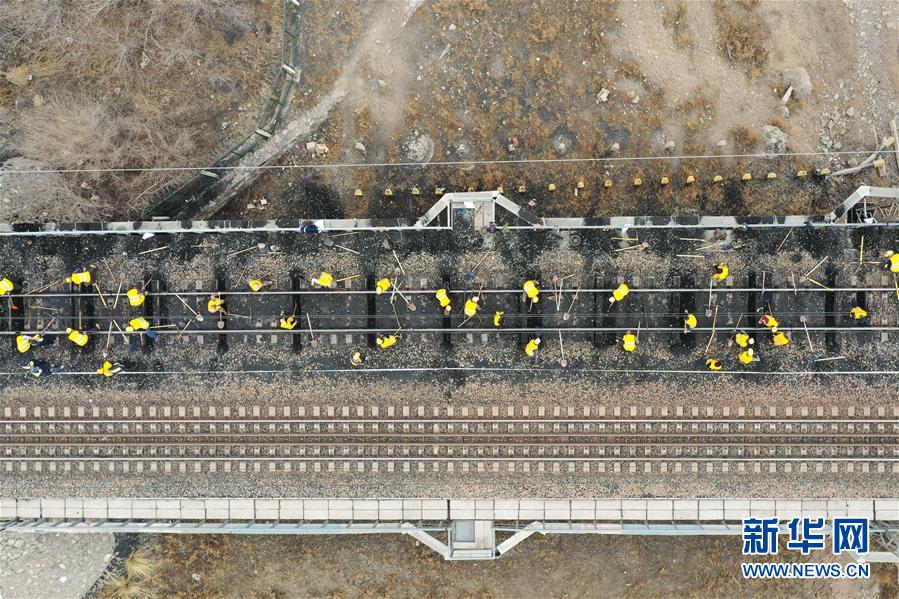 3月23日,在京包铁路包头市境内,工人在铁轨上作业(无人机照片)。 新华社记者 达日罕 摄