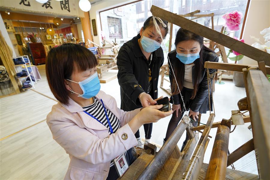 3月23日,重庆荣昌夏布小镇的壹秋堂夏布坊内,非遗传承人颜先英(左一)在向两名学员传授荣昌夏布编织技艺。新华社记者 刘潺 摄