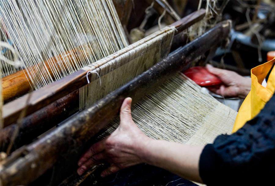 3月23日,重庆荣昌夏布小镇加合夏布的生产车间内,荣昌本地的织女在织布机上工作。新华社记者 刘潺 摄