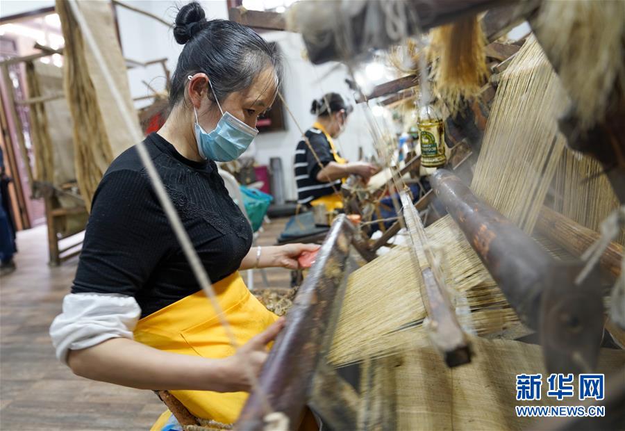 3月23日,重庆荣昌夏布小镇加合夏布的生产车间内,两名荣昌本地的织女在使用织布机织造荣昌夏布。新华社记者 刘潺 摄