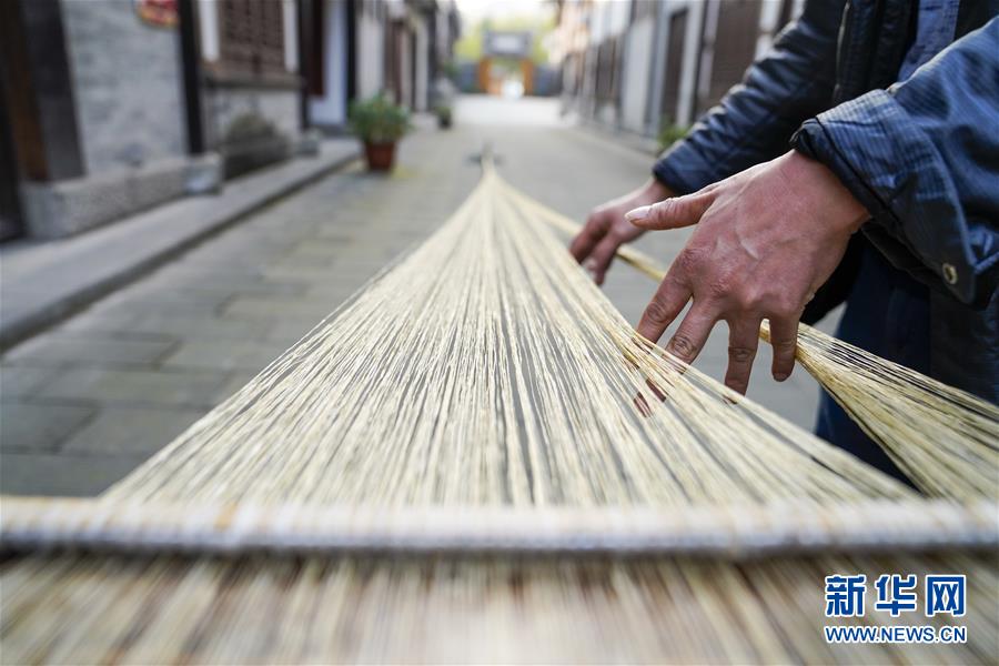 3月23日,重庆荣昌夏布小镇内,一名加合夏布的技术工人在进行荣昌夏布生产的整经工艺作业。新华社记者 刘潺 摄
