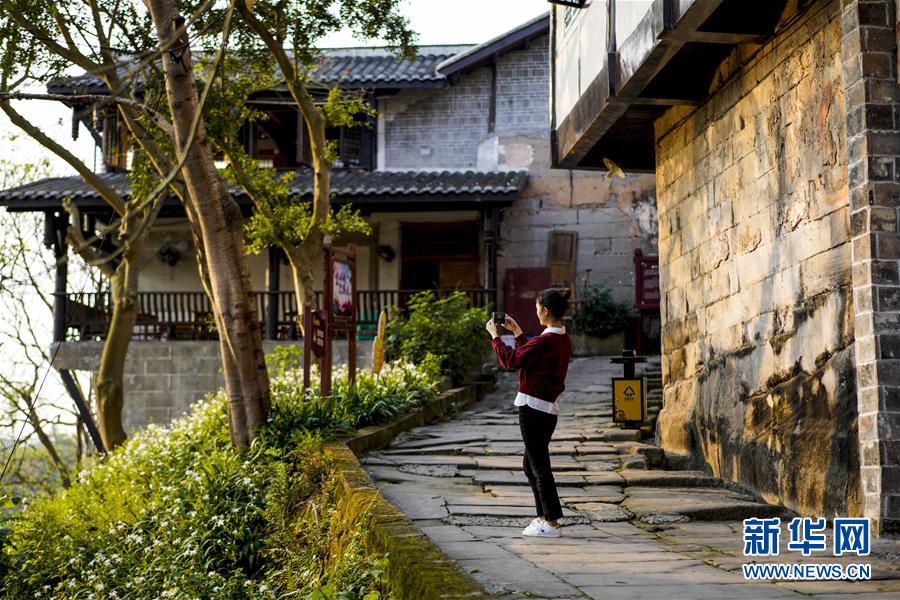 3月24日,游客用手机拍摄夕阳下的万灵古镇。 近日,重庆荣昌区万灵古镇有序恢复开放。古镇美丽的景色和浓郁的移民文化吸引游客前往游览。 新华社记者 刘潺 摄