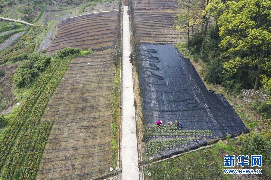 3月25日,放牛坪村村民在苗木基地内作业(无人机照片)。 新华社记者 王全超 摄